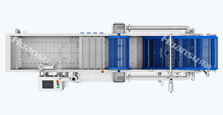 環(huán)速噴淋清洗機,使用舞動式曝氣清洗方式,將小龍蝦在清洗槽中大面積展開,利用渦流對其表面和關節(jié)縫隙里的泥沙進行微震沖刷,在不傷害小龍蝦生命安全與外觀品相的前提下,進行全面透徹的清潔。深層污穢被剝離之后,再通過毛發(fā)去除裝置、漂浮物去除裝置、過濾輸送裝置依次去除小龍蝦附著的水藻等柔性纏繞物、泥沙等雜質(zhì),經(jīng)過輸送裝置來到噴淋環(huán)節(jié),對小龍蝦實施最后的凈水沖洗。